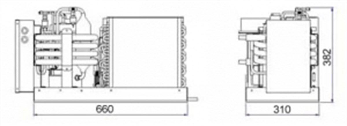 Kompresör, deniz suyu kondansesi, evaporator ve fan tek bir kompakt ünitede birleştirilmiştir. İki veya bitişik dört kabin için kullanılabilir. Kontrol paneli dahildir.
