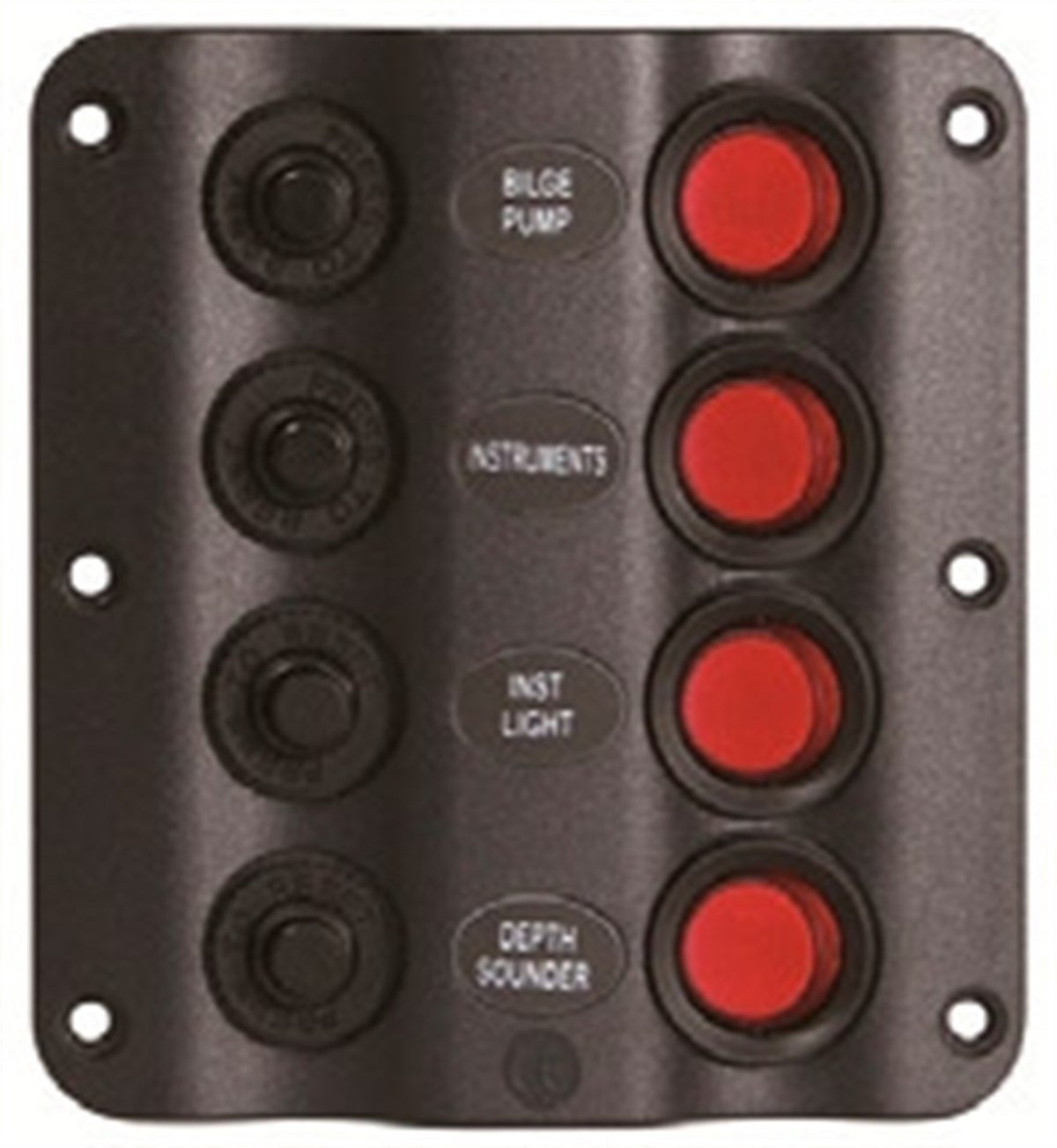 Sigorta paneli. 12V DC. Dalga dizaynlı. Siyah plastik. Otomatik sigortalı ve led indikatörlü switch’li.